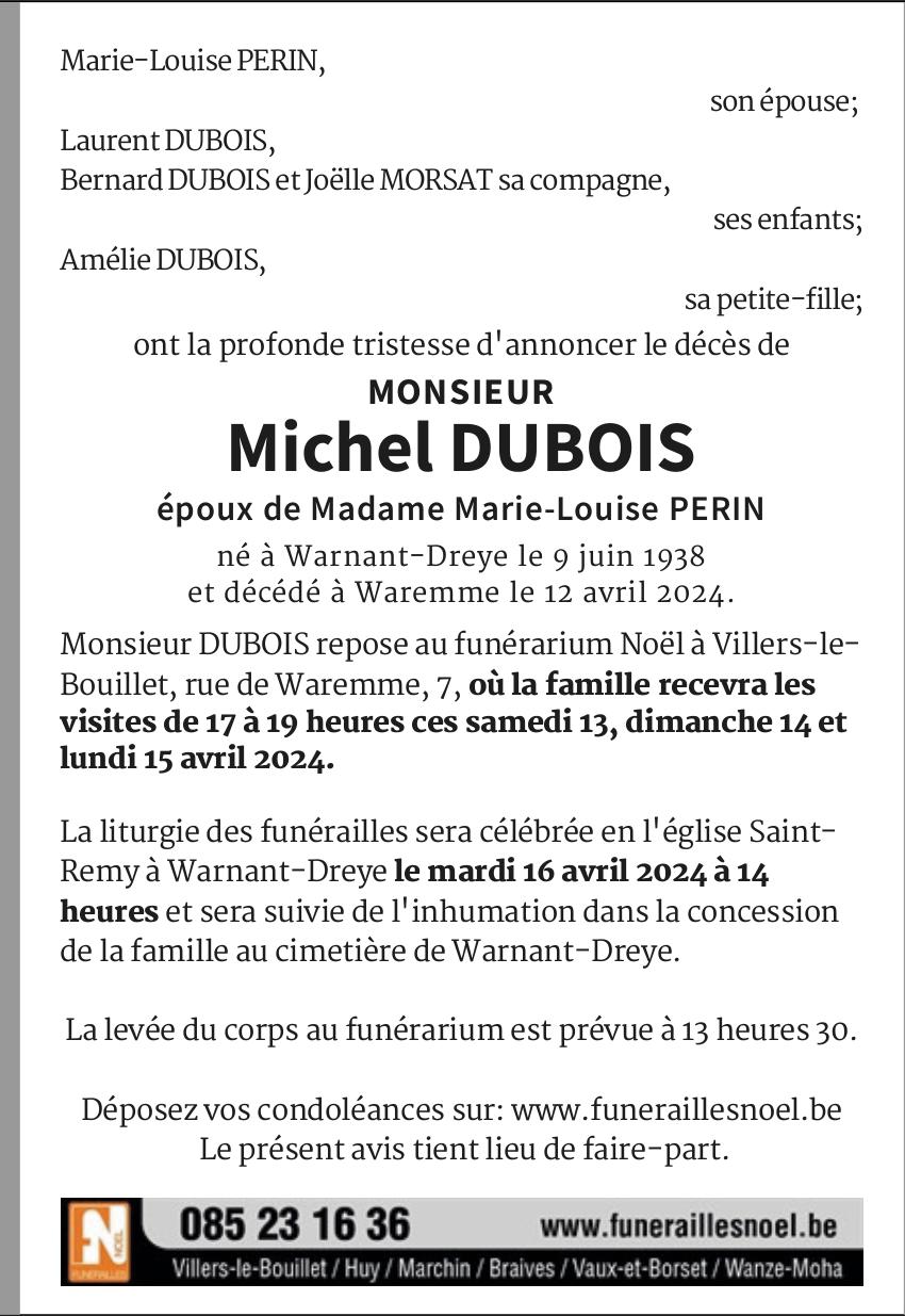 Décédé à Waremme (4300) le vendredi 12 avril 2024 à l'âge de 85 ans