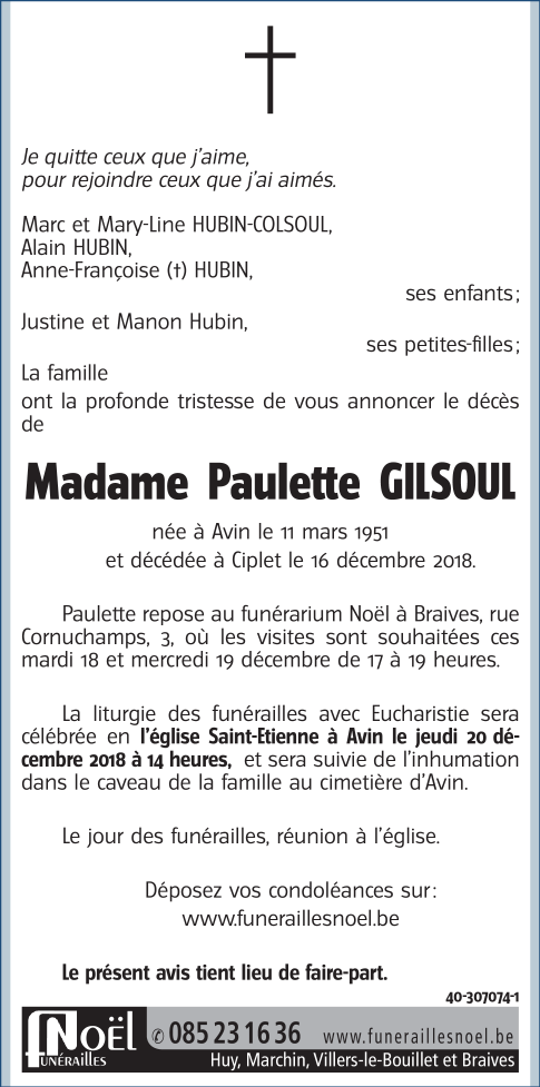 Décédée à Ciplet (4260) le dimanche 16 décembre 2018 à l'âge de 67 ans