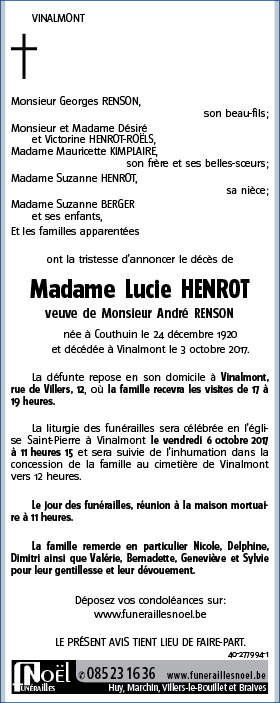 Décédée à Vinalmont (4520) le mardi 3 octobre 2017 à l'âge de 96 ans