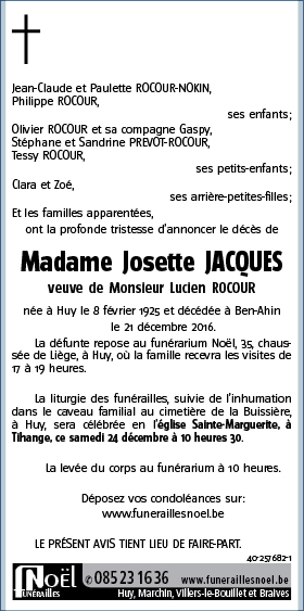 Décédée à Gives (4500) le mercredi 21 décembre 2016 à l'âge de 91 ans