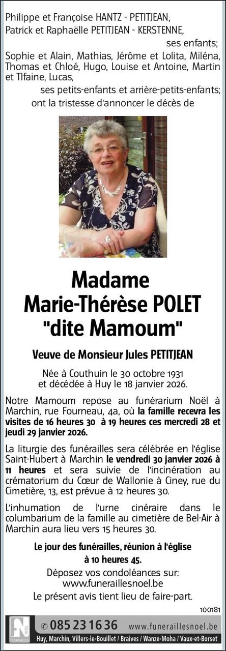 Décédée à Huy (4500) le dimanche 18 janvier 2026 à l'âge de 94 ans