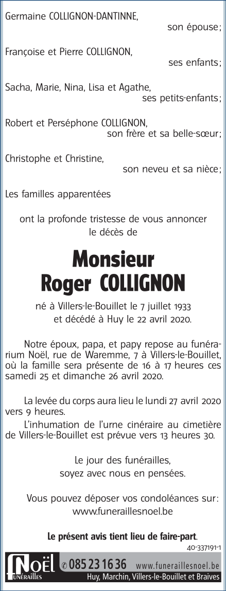 Décédé à Huy (4500) le mercredi 22 avril 2020 à l'âge de 86 ans