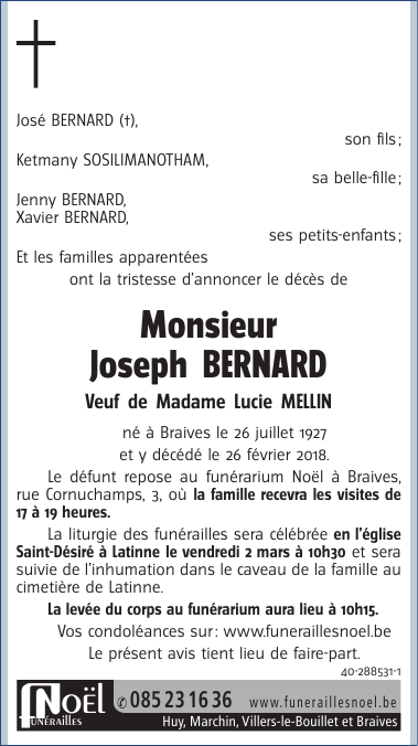 Décédé à Braives (4260) le lundi 26 février 2018 à l'âge de 90 ans