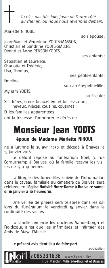 Décédé à Braives (4260) le mercredi 13 janvier 2016 à l'âge de 85 ans