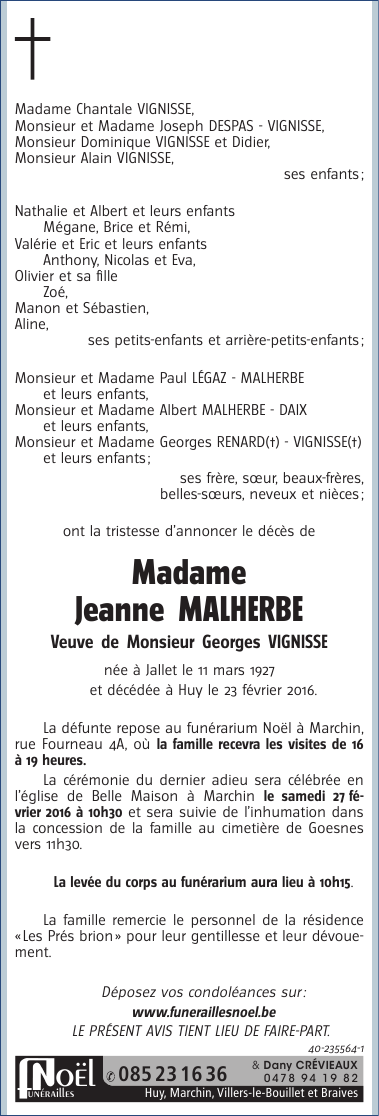 Décédée à Ben-Ahin (4500) le mardi 23 février 2016 à l'âge de 88 ans