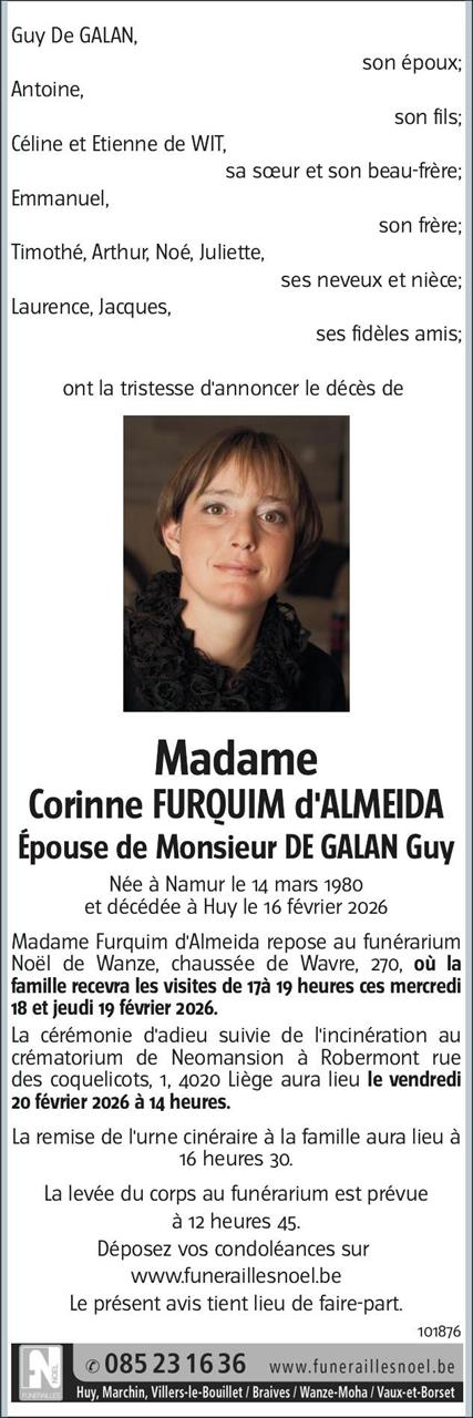 Décédée à Huy (4500) le lundi 16 février 2026 à l'âge de 45 ans