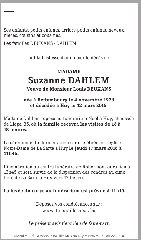 Décédée à Huy (4500) le samedi 12 mars 2016 à l'âge de 87 ans