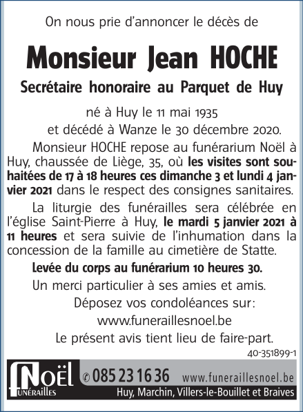 Décédé à Moha (4520) le mercredi 30 décembre 2020 à l'âge de 85 ans