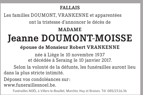 Décédée à Seraing (4100) le mardi 10 janvier 2017 à l'âge de 79 ans