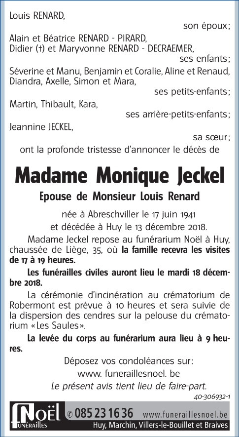 Décédée à Huy (4500) le jeudi 13 décembre 2018 à l'âge de 77 ans
