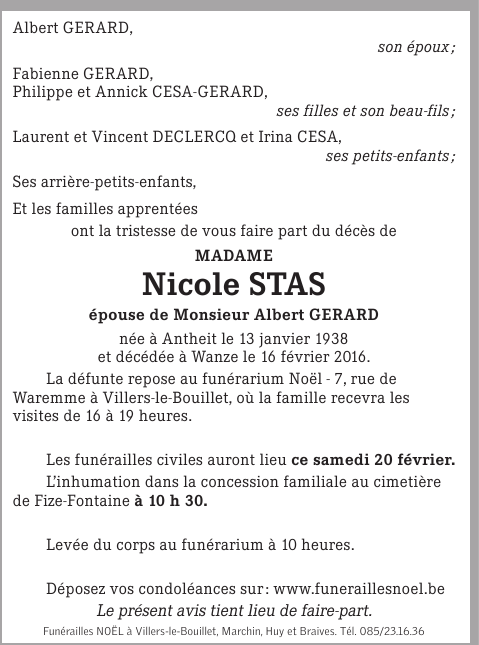 Décédé à Wanze (4520) le mardi 16 février 2016 à l'âge de 78 ans