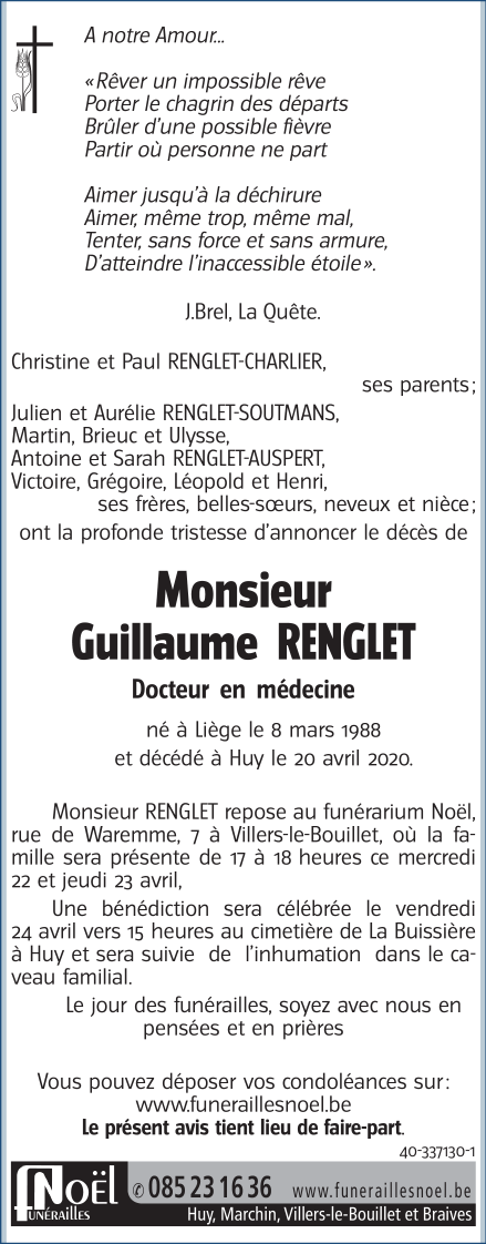Décédé à Huy (4500) le lundi 20 avril 2020 à l'âge de 32 ans
