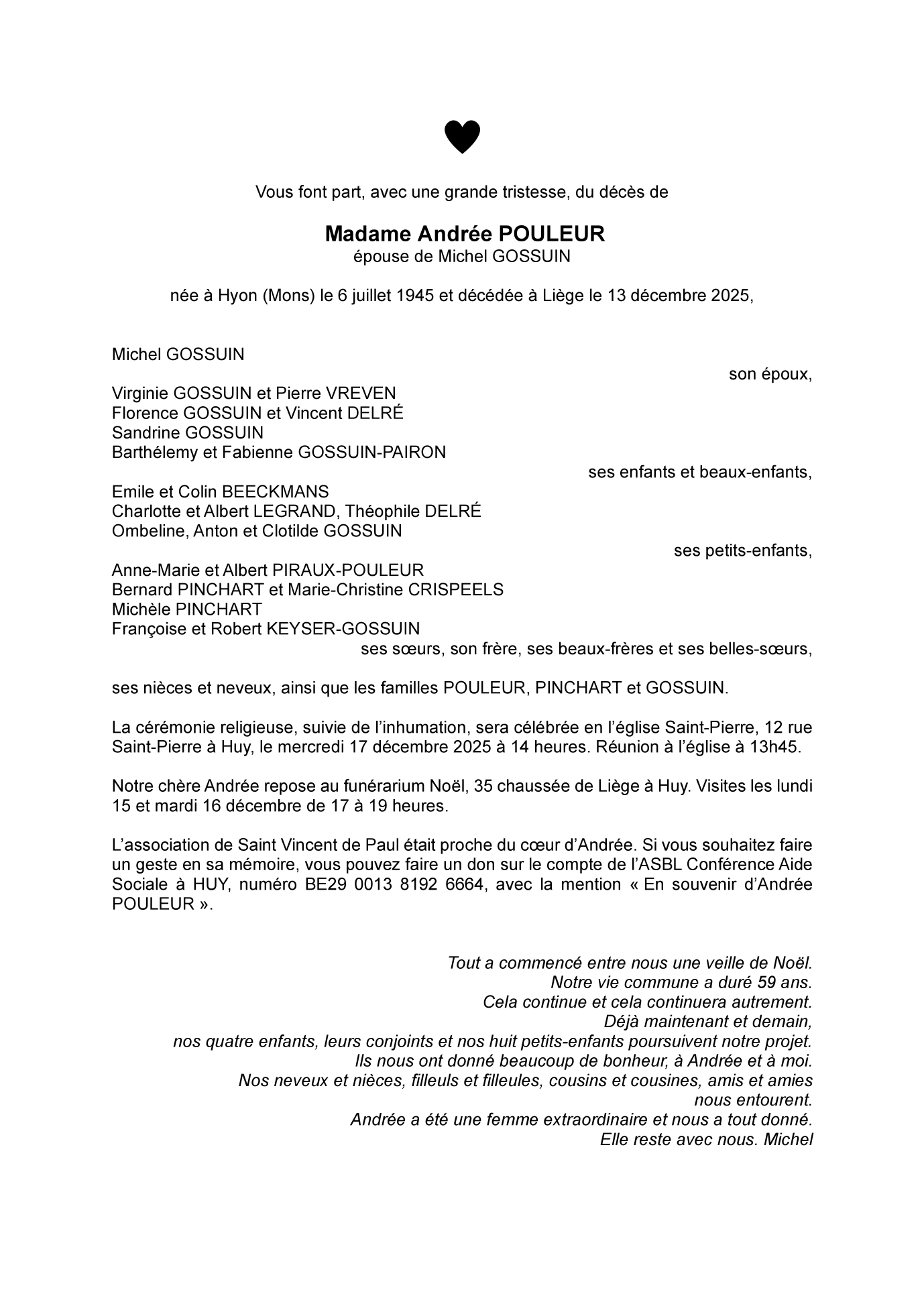 Décédée à Liège (4000) le samedi 13 décembre 2025 à l'âge de 80 ans