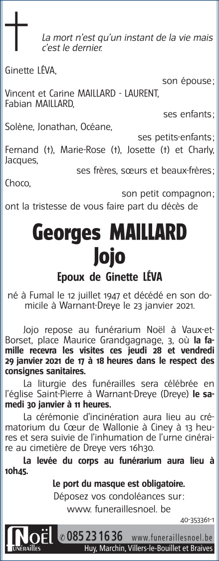 Décédé à Warnant-Dreye (4530) le samedi 23 janvier 2021 à l'âge de 73 ans