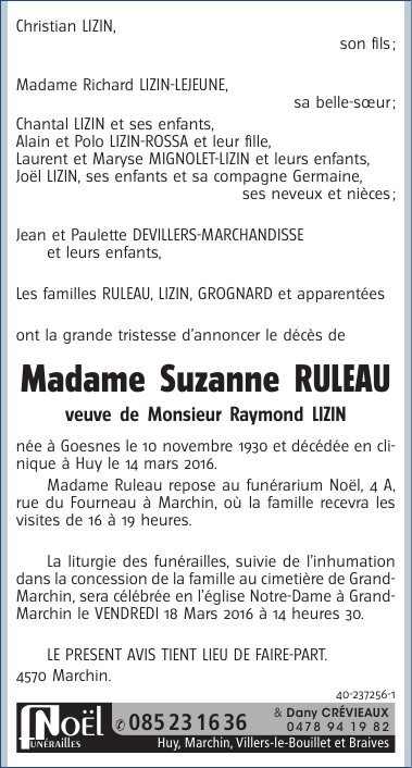 Décédée à Huy (4500) le lundi 14 mars 2016 à l'âge de 85 ans