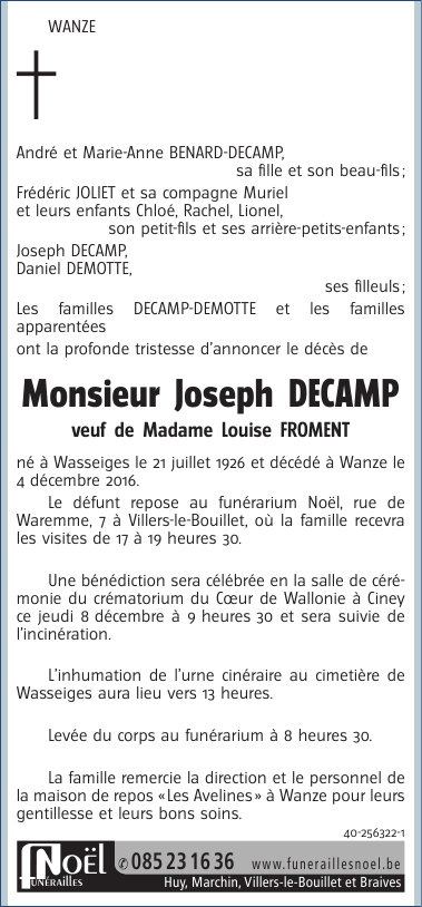 Décédé à Wanze (4520) le dimanche 4 décembre 2016 à l'âge de 90 ans
