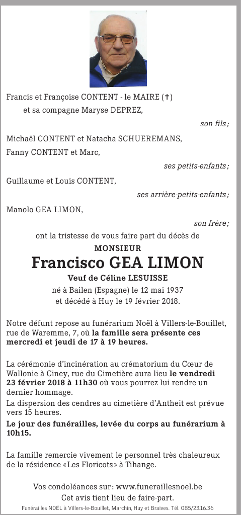 Décédé à Huy (4500) le lundi 19 février 2018 à l'âge de 80 ans
