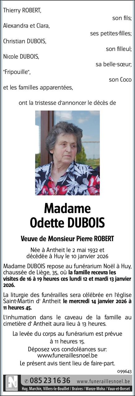 Décédée à Tihange (4500) le samedi 10 janvier 2026 à l'âge de 93 ans